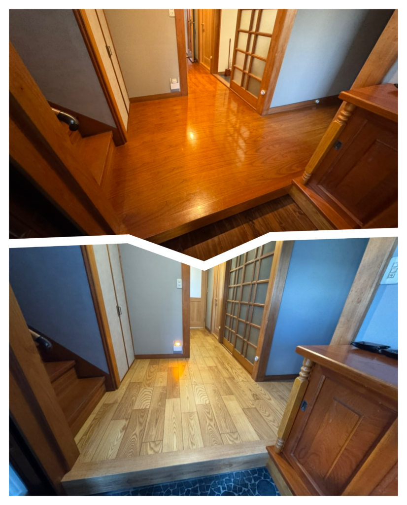 blog 小田原でフローリングリフォーム 床・フローリングリフォーム 玄関廊下の床の張り替えです 薄いベニヤを貼り合わせた複合フローリングは、長年縁の下の湿気を吸い接着剤の機能がなくなり、ただの薄いベニヤを重ねただけになり、上を歩くとベコベコになります。 断熱材、捨て貼り+フローリングでしっかりとした床になりました。 フローリング材も明るい材で、家の真ん中で窓の無い、暗い廊下が明るくなりました! 前の記事 次の記事 一覧へ戻る