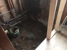 浴室の解体後クリナップアクリアバスユニットバス、洗面所天井・壁・床解体後、床は東洋テックスフロアー、天井・壁ビニールクロス、アイカセラール |