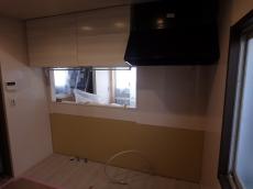 | クロスを貼っていきます | キッチン部分は耐水性のあるキッチンパネルを貼っていきます。 | 新しいキッチンまずは吊り戸とレンジフードから |