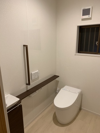 | 1階トイレ 小便器があると洋便器まわりが汚れなくて済みますが、そこまで大勢の人が使用するかと、その分小便器の掃除も必要になってきます 今回無くすことにしました。 |