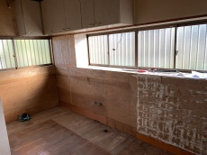 新しくクッションフロアーの床を貼るための下地を作ります。 | 木製の窓枠もホワイトの枠に交換 壊した壁をプラスターボードで塞いで行きます |