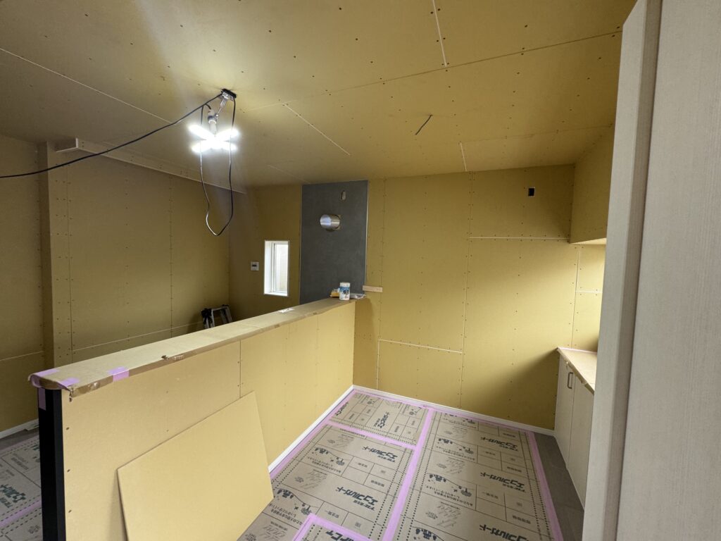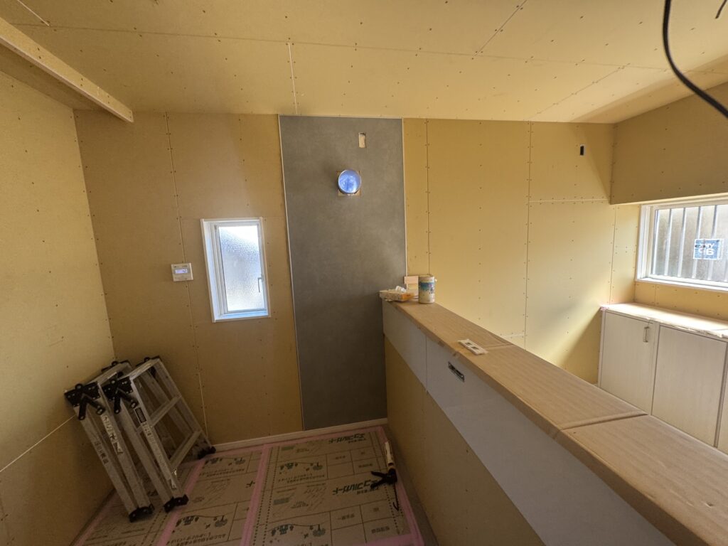 その後、構造下地の補強を行い、新たなレイアウトに合わせて電気配線・換気ダクトも整理。石膏ボードを張り終えると、空間の形が整い、キッチンカウンターや造作収納の設置位置も明確になりました。