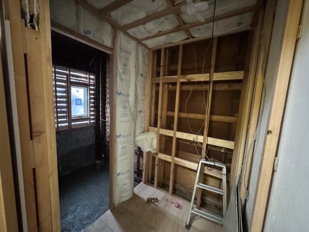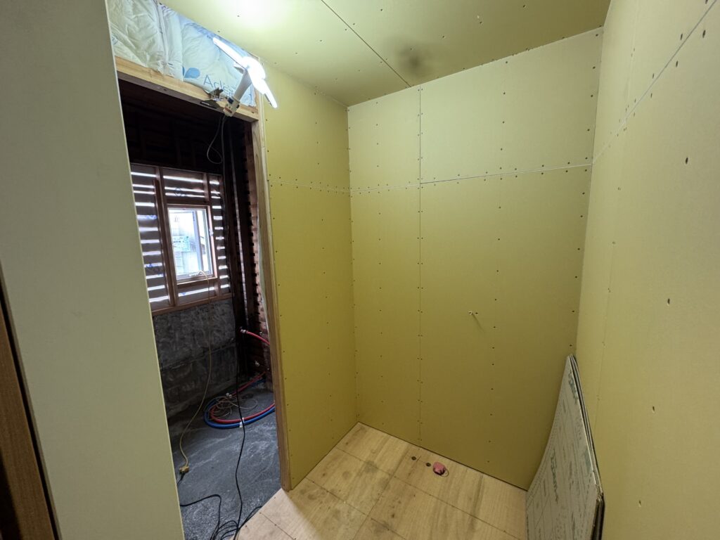 給排水管や電気配線も新しい設備に合わせて適切に引き直し、安全性とメンテナンス性を確保。洗面室側でも下地の組み直しと断熱補強を行い、石膏ボードが張られていくことで空間の形状が徐々に整ってきました。