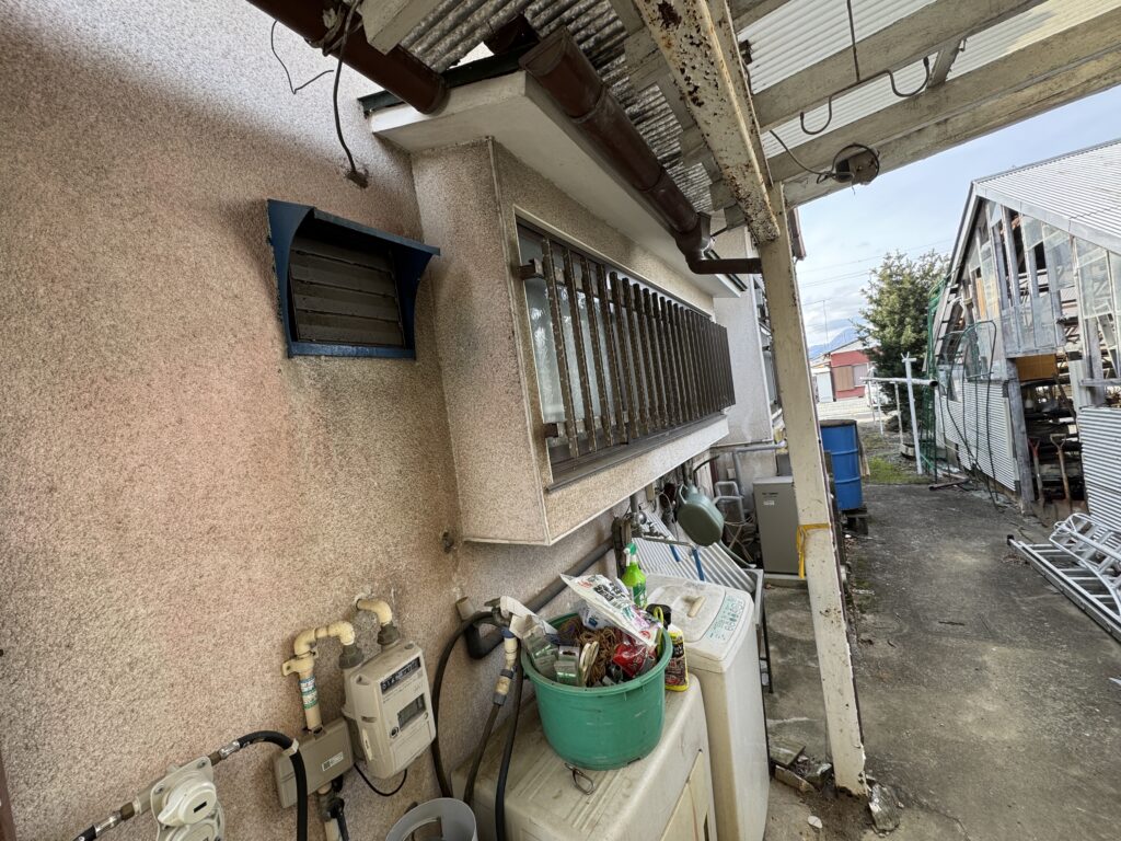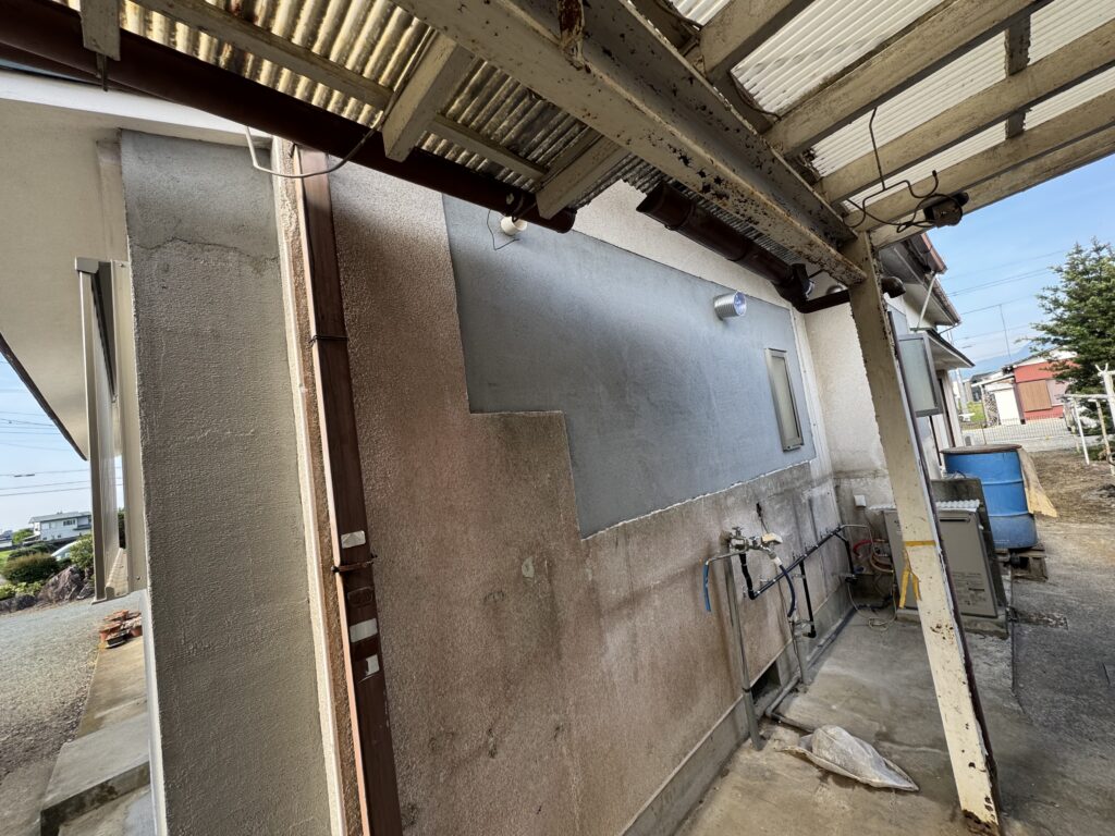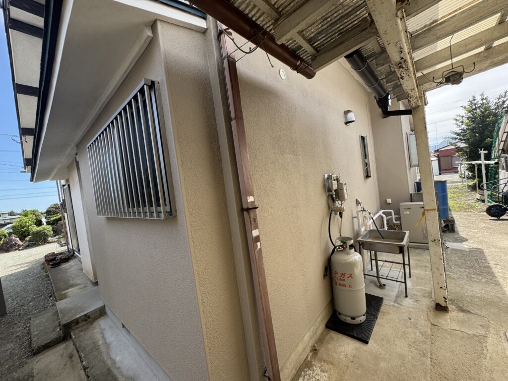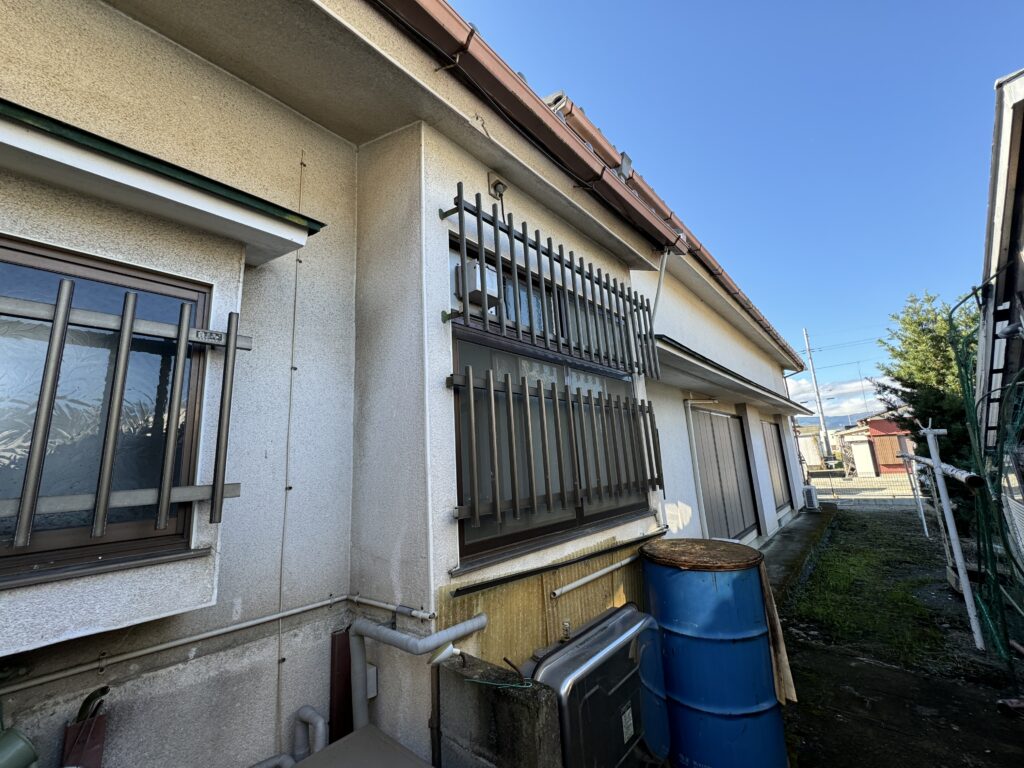 外壁はモルタル仕上げが長年風雨にさらされ、汚れの付着やひび割れ、排水設備まわりの老朽化が確認できます。