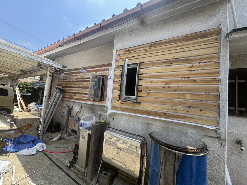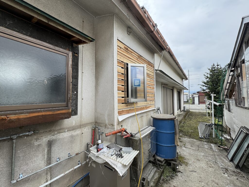 既存外壁の一部では、出窓部分をフラットに納めるために外壁を削り、下地の補修と新規面の形成を行いました。躯体が露出した箇所には木下地を組み直し、新しい窓枠に合わせて防水シート・胴縁を施工することで、雨仕舞い性能を高めています。新しいYKK製のサッシに交換したことで断熱性・気密性も大きく向上しました。