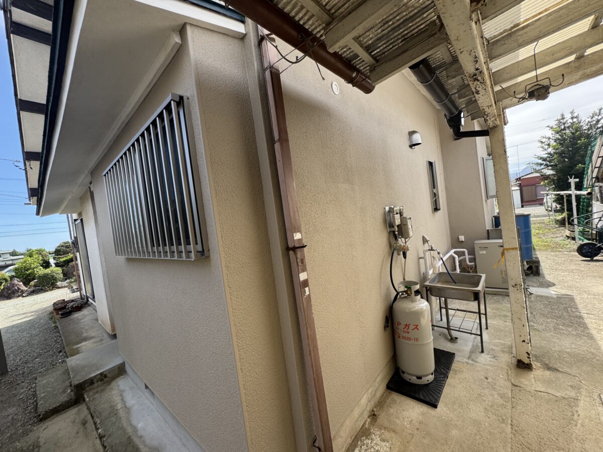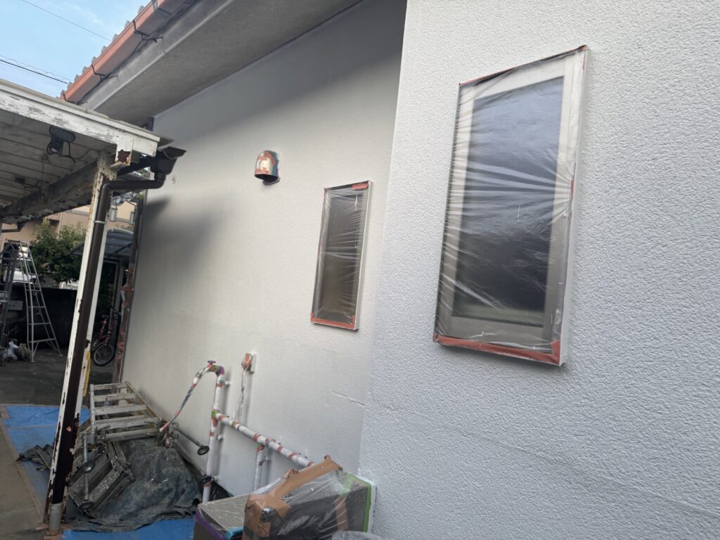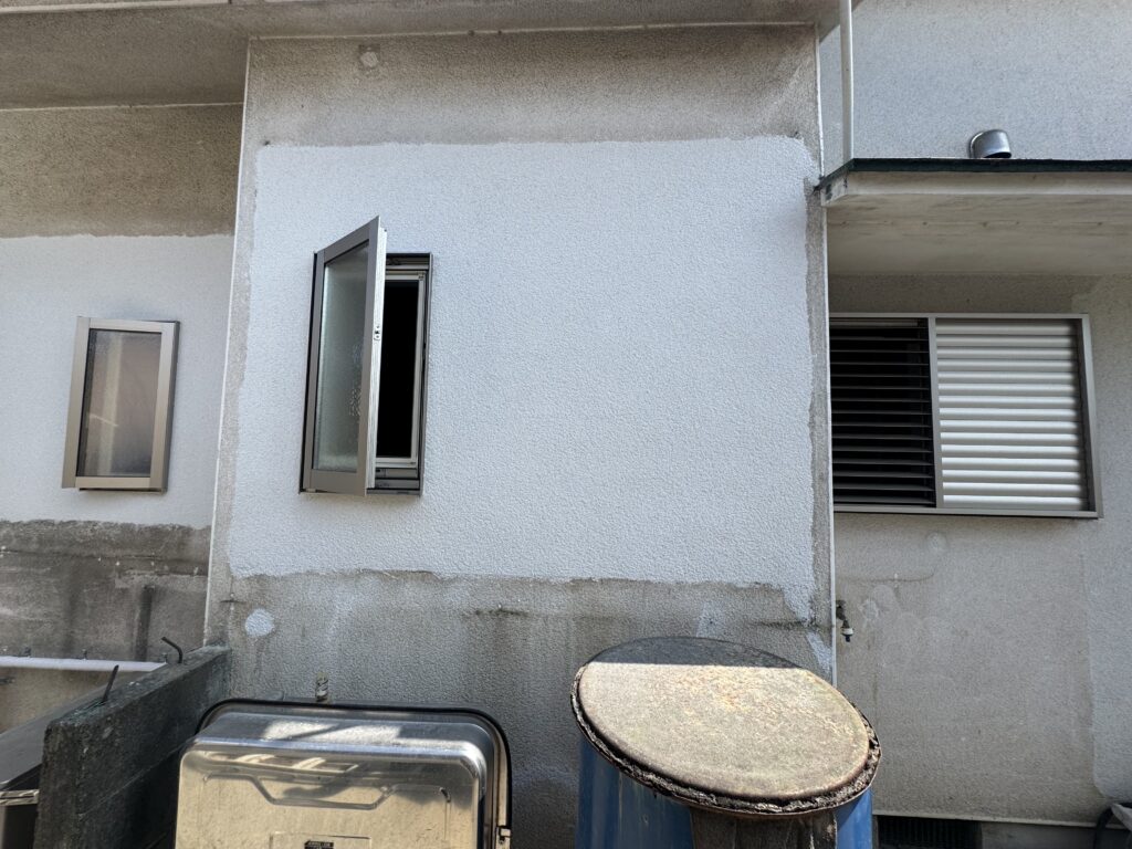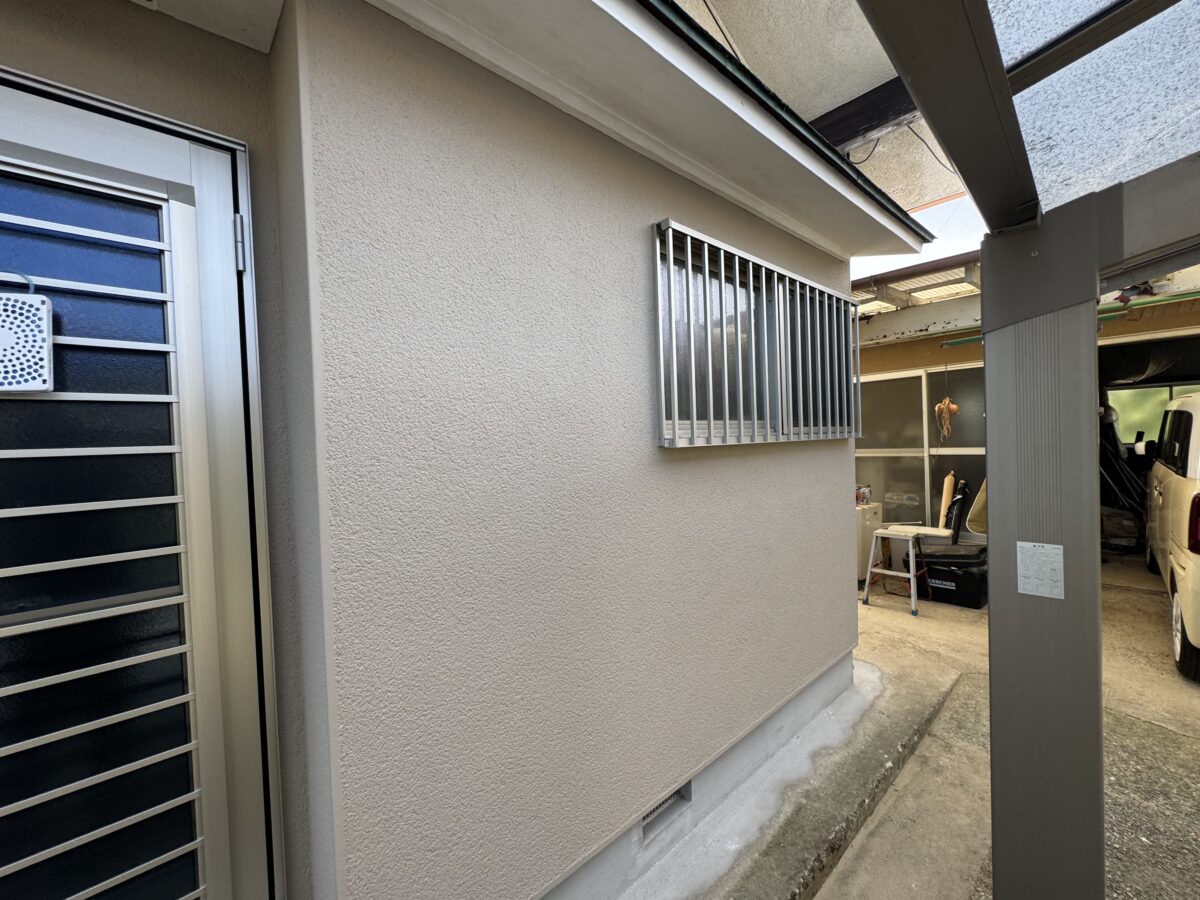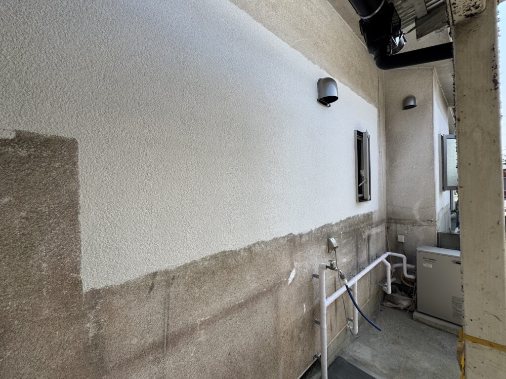 外壁は、既存の劣化していた部分を補修したうえで全面を塗り替え、明るく清潔感のある外観へとリフレッシュ。補修跡も丁寧に馴染ませ、凹凸の質感が整った上質な仕上がりとなっています。