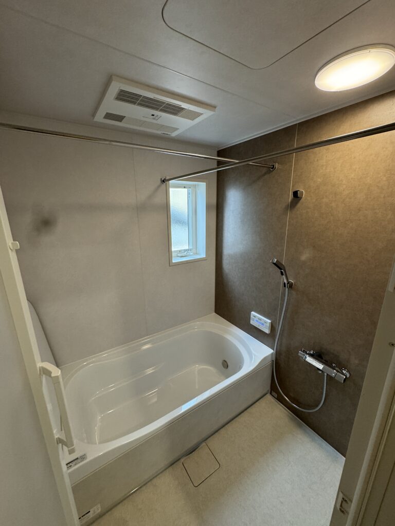 保温性の高い浴槽と断熱構造により、冬場でも湯温が逃げにくく、快適な入浴時間を実現。手すりの設置や段差の少ない設計で、安全性にも配慮しています。壁パネルは落ち着いたトーンでまとめられ、照明との相性も良く、温かみのある空間となりました。