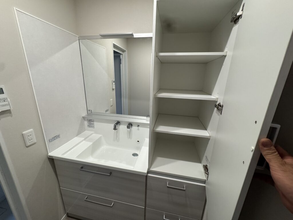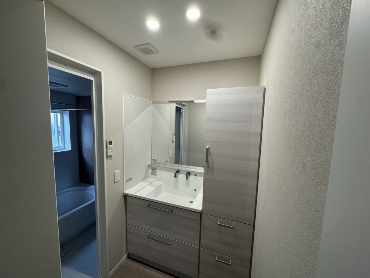 洗面室には〈クリナップ S〉の洗面化粧台を新設し、広いボウルと使いやすい収納が毎日の家事をサポートします。