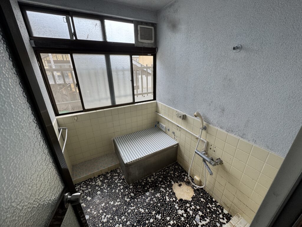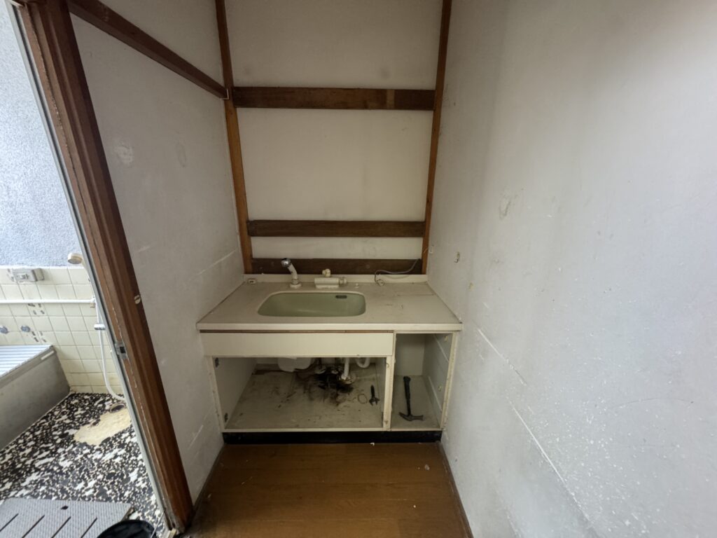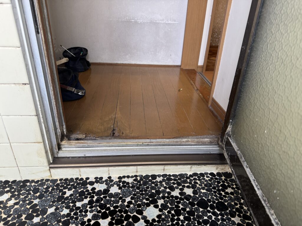 また、浴室入口の木部には腐食が見られ、湿気の影響を強く受けている様子が確認できます。